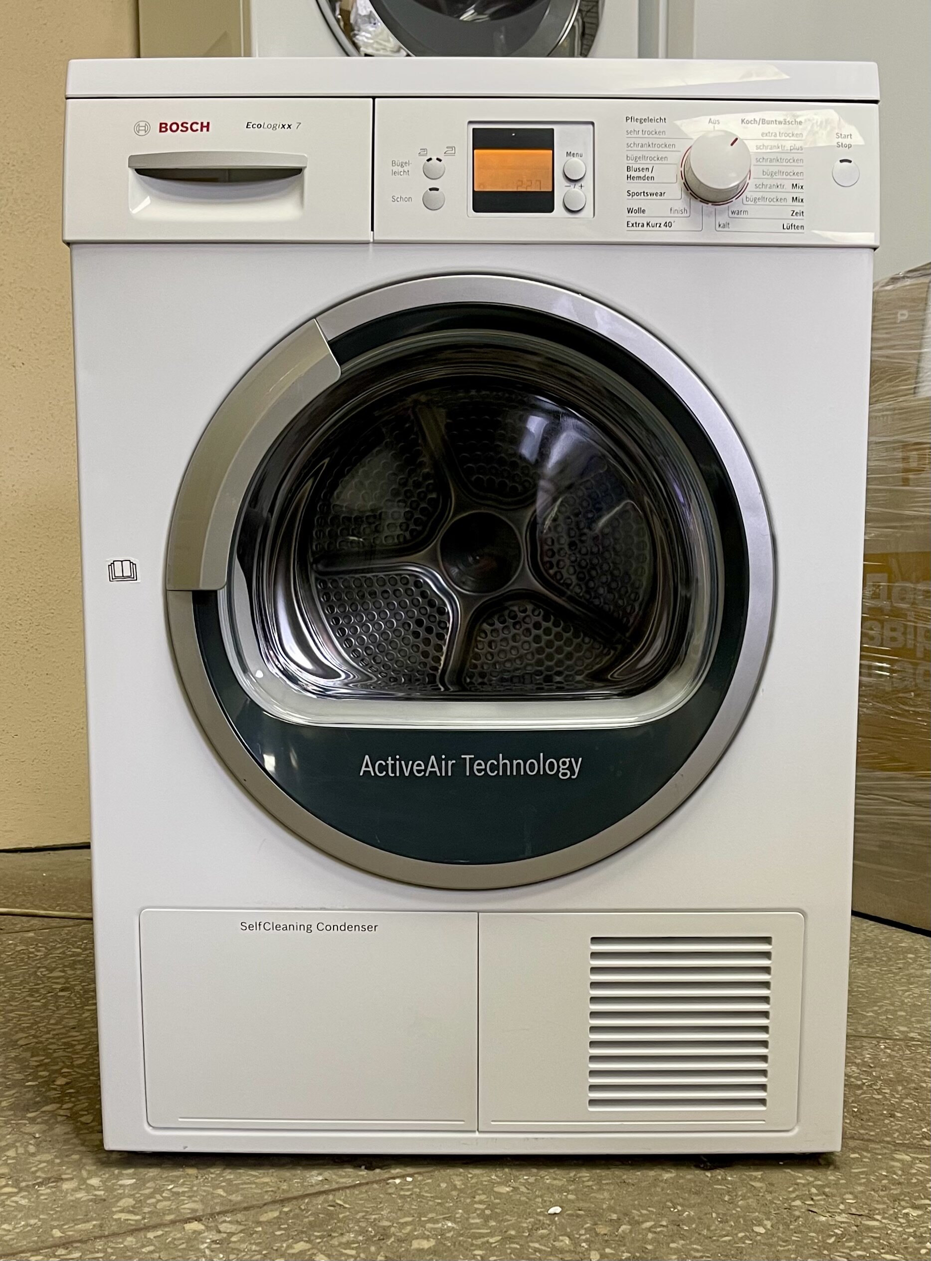 Оснащення: дисплей із відображенням часу до завершення, сенсори вологості, програма “Легка праска” (Bügel leicht)