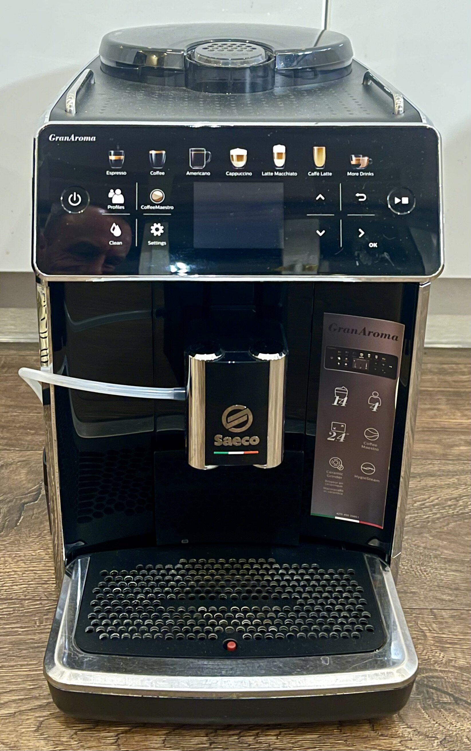 Автоматична кавомашина Saeco GranAroma з потужністю 1500 Вт, тиском помпи 15 бар, вбудованою керамічною кавомолкою та автоматичною системою приготування напоїв з молоком. Готує широкий вибір напоїв: еспресо, лунго, американо, капучино, латте, латте макіато тощо, має профілі користувачів та систему автоматичного очищення молочного тракту.