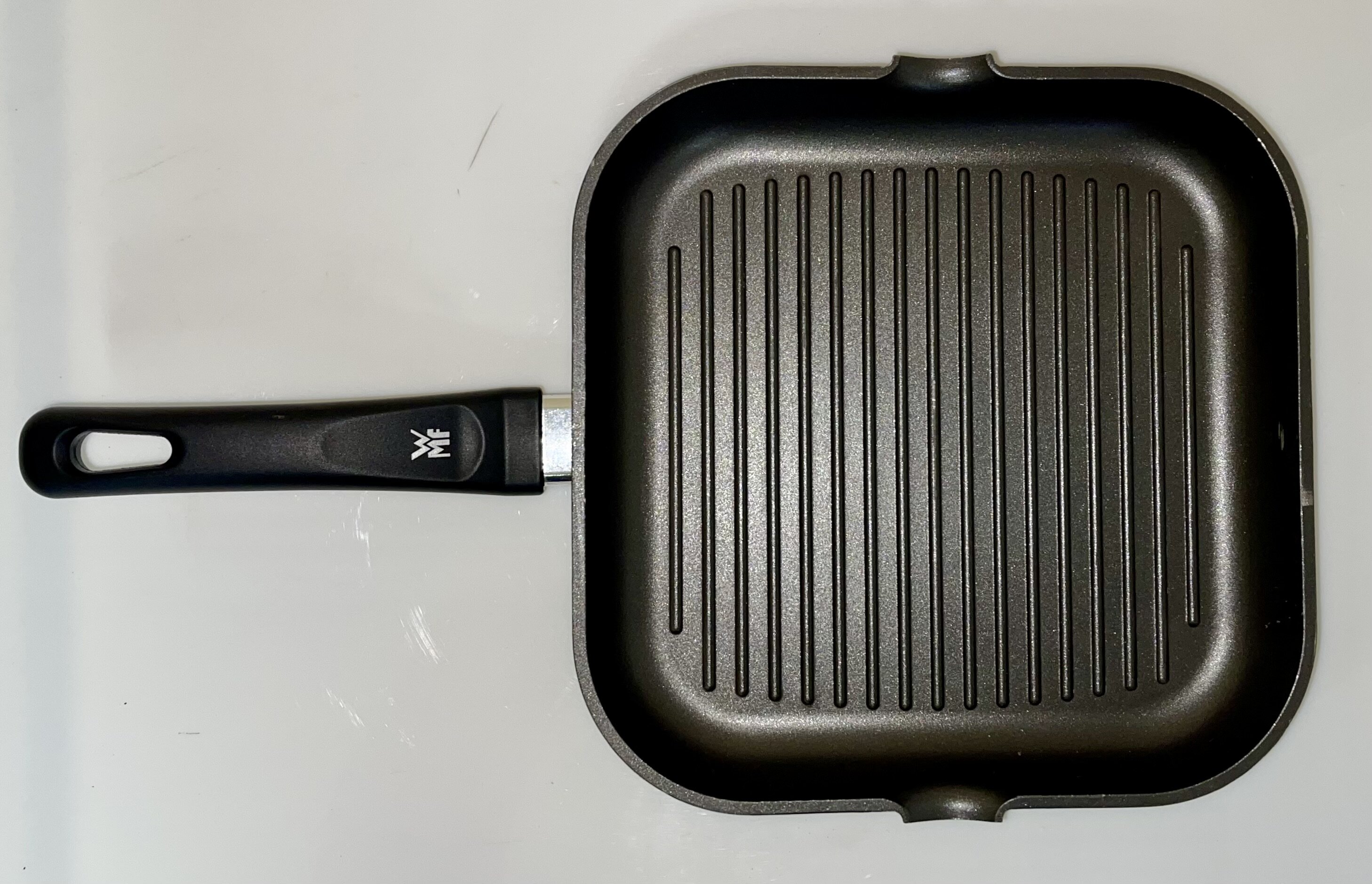 Квадратна сковорода-гриль WMF Party Grill Pan з рифленим дном та фірмовою ергономічною ручкою.